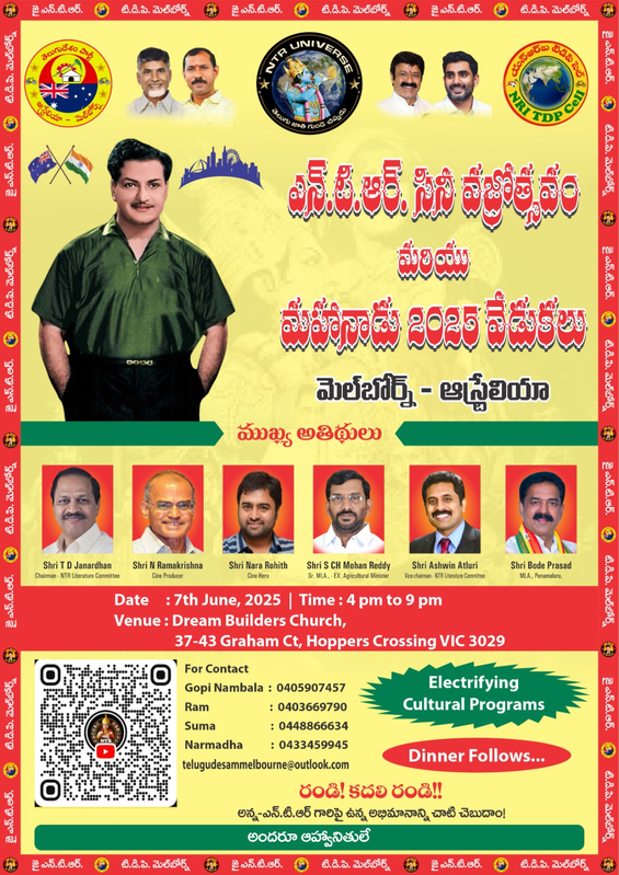 Join us in paying tribute to a towering personality and in celebrating the vibrant Telugu spirit in Melbourne. Let’s make this a historic and unforgettable gathering!